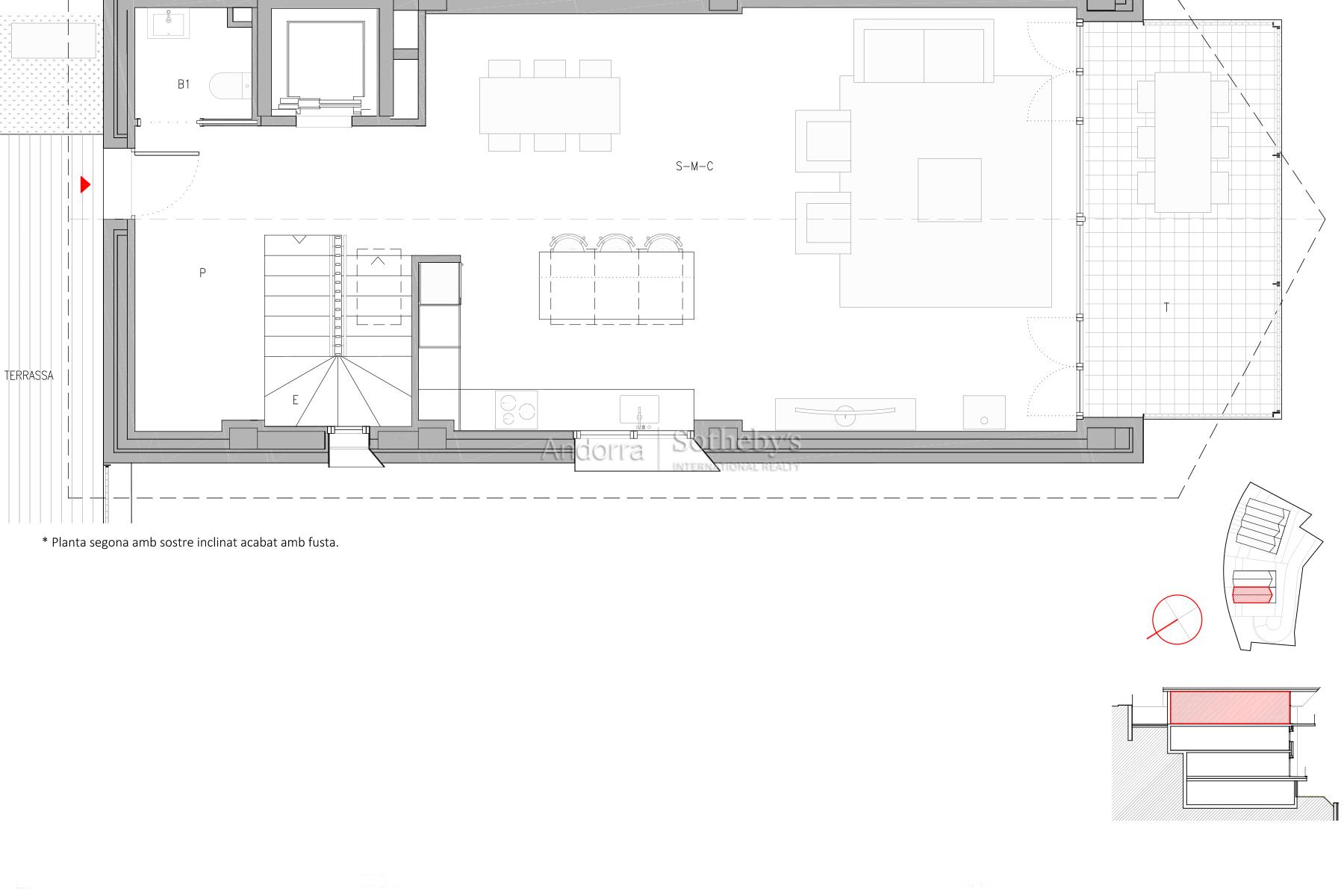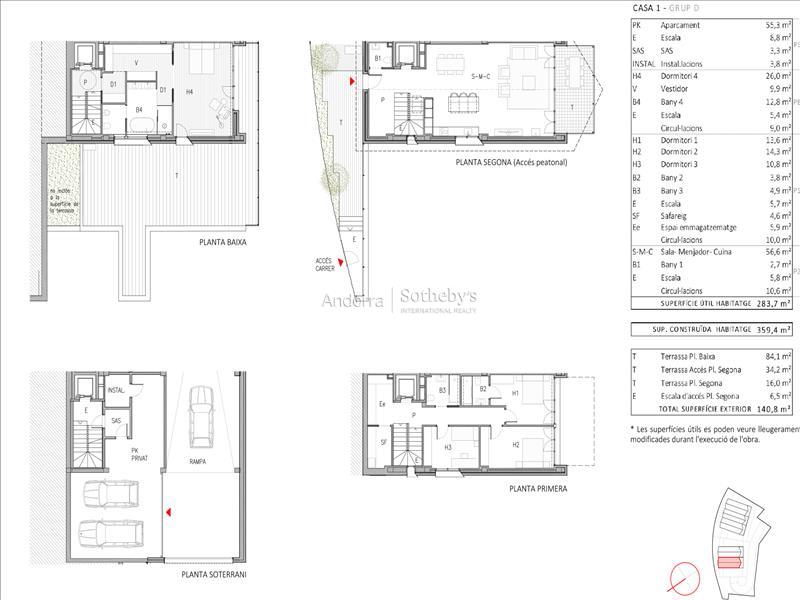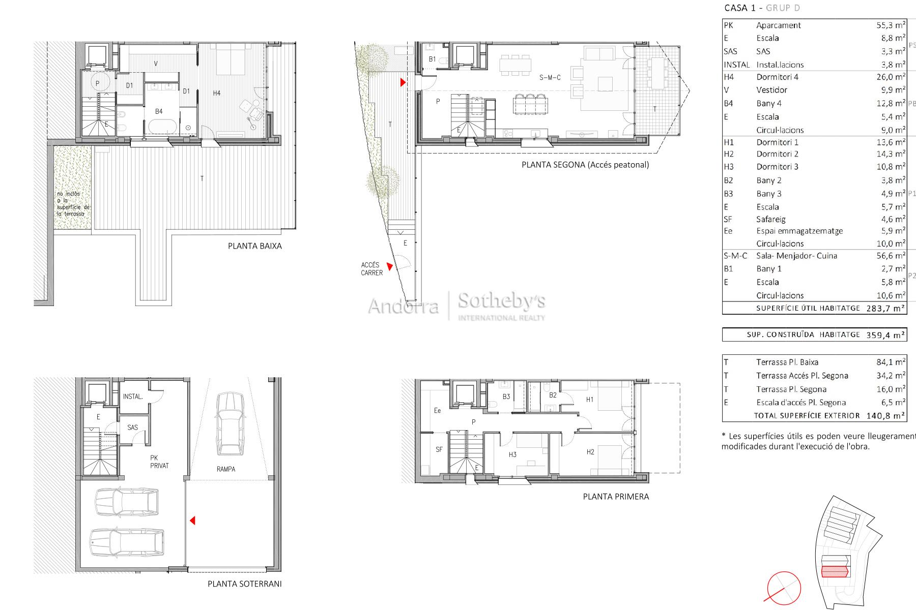 Exclusive newly built house located in La Pleta del Solà del Tarter, one of the most sought-after residential areas due to its proximity to the Grandvalira ski slopes and its privileged natural environment. The house has a constructed area of 359.4 m², of which 283.7 m² are habitable, and a large outdoor area of 140.8 m² distributed over several terraces: one of 84.1 m², another of 34.2 m², one of 16 m² and an external staircase of 6.5 m². The house has four bedrooms and four bathrooms, offering spacious, bright spaces designed for comfort. The day area includes a living-dining room with open kitchen, ideal for creating an integrated and functional environment. It also has an independent laundry area and a closed garage of 55 m², with capacity for several vehicles. The house offers quality finishes and modern architecture, designed to integrate with the environment and make the most of natural light and views. *The usable surfaces may be slightly modified during the execution of the work.Features