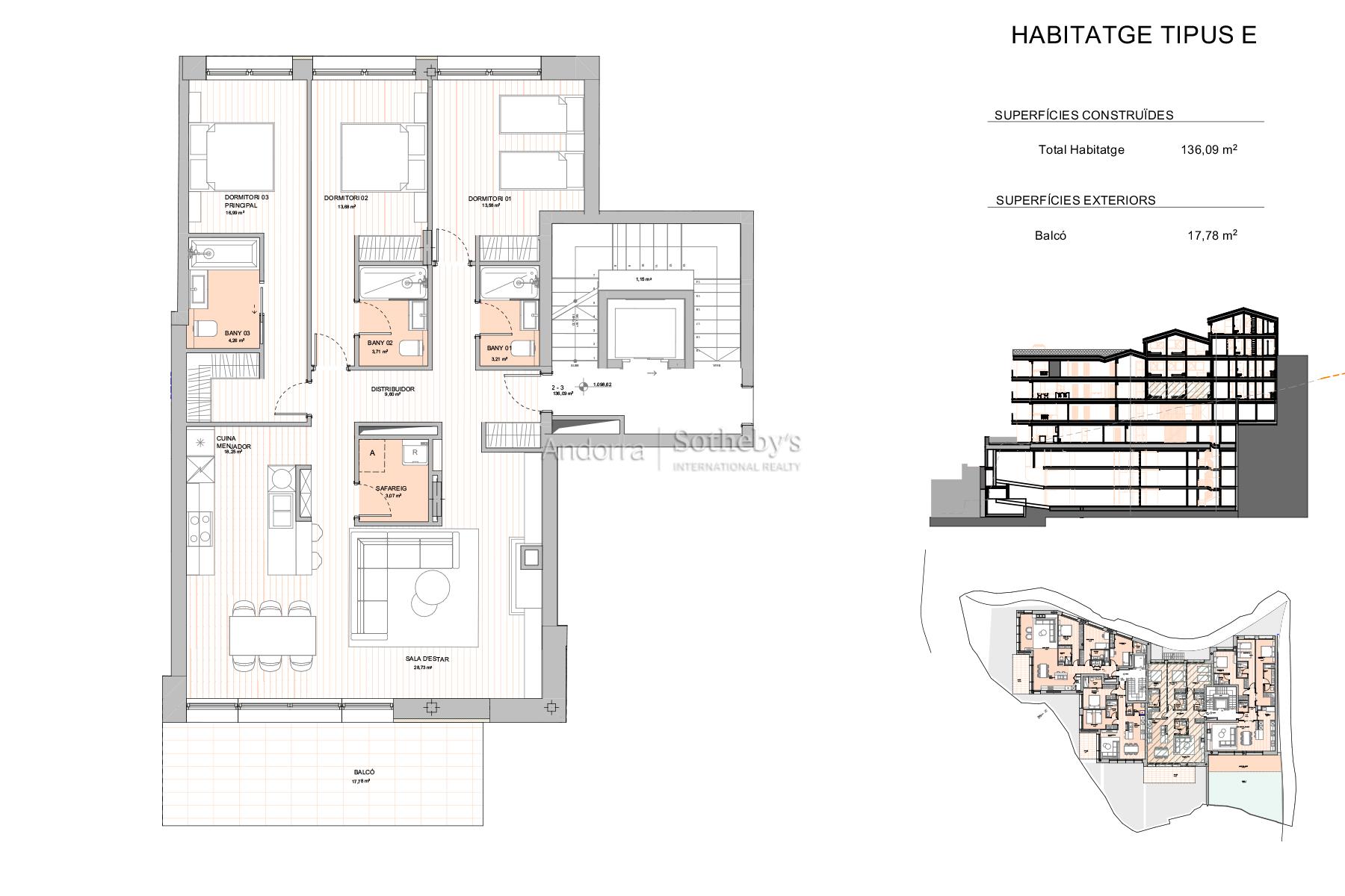 Exclusivo apartamento de obra nueva en venta en Escaldes-Engordany, ubicado en una zona residencial tranquila y bien comunicada. La vivienda dispone de una superficie construida de 136,09 m², con una distribución amplia y funcional que incluye tres dormitorios, dos de ellos en suite, y un tercer dormitorio con baño completo independiente, situado fuera de la habitación. El salón-comedor con cocina abierta ofrece un espacio moderno y luminoso, con acceso directo a un balcón de 17,78 m², ideal para disfrutar del entorno. El apartamento cuenta además con sala de lavandería independiente, acabados contemporáneos y una distribución pensada para garantizar el máximo confort y privacidad. Plaza de aparcamiento y trastero no incluidos en el precio. El comprador podrá elegir el box según sus necesidades. Una excelente oportunidad para vivir o invertir en una de las zonas más demandadas de Escaldes-Engordany.Características
