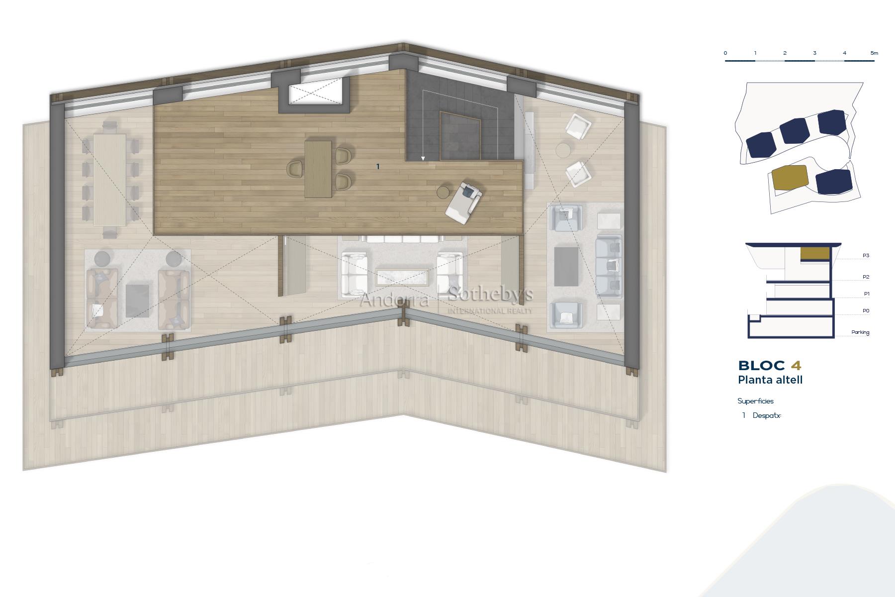 Exclusivo chalet para comprar en el encantador pueblo de Ordino, el primer destino del Principado de Andorra nombrado como Reserva de la Biosfera. Esta sensacional propiedad forma parte de una promoción de obra nueva que destaca por su privilegiada ubicación a la vez que por su lujoso diseño, ideado por el prestigioso estudio de arquitectura Rafael De la-Hoz Arquitectes. Se trata de un inmueble de nueva construcción de aproximadamente 669 m² construidos, los cuales incluyen múltiples terrazas orientadas de forma óptima para aportar la máxima exposición posible a la luz natural, y disfrutar a su vez de las magníficas vistas de Ordino y sus valles. La planta baja está destinada a la desconexión, por lo que cuenta con zona de spa y gimnasio, además de una sala de cine. En esta planta se encuentran además dos habitaciones dobles en suite con baño completo, un aseo y una zona de almacenamiento, además de una amplia terraza. En la primera planta se encuentra la continuación de la zona de descanso, con dos habitaciones en suite con baño completo, y la master suite de la propiedad, con vestidor y baño completo. Todas las habitaciones tienen salida a la terraza. La segunda planta está distribuida en una gran cocina con manzana central, equipada con las últimas tecnologías y abierta a un acogedor comedor con acceso a la terraza. En esta zona se encuentra igualmente un salón y una biblioteca, ambos espacios también con salida a la terraza, un aseo y una zona de lavandería. En la última planta, abuhardillada, se ubica un funcional despacho. la propiedad tiene 8 plazas de parquing de 11,5 m2 cada una, en total unos 706 m2 de zona de parquing. Los acabados son elegantes y de la más alta calidad, y el diseño de la propiedad combina elementos modernos, como las grandes vidrieras, con la clásica arquitectura andorrana en piedra y madera para integrarse de la mejor forma en el entorno y no perder la esencia del país.Características