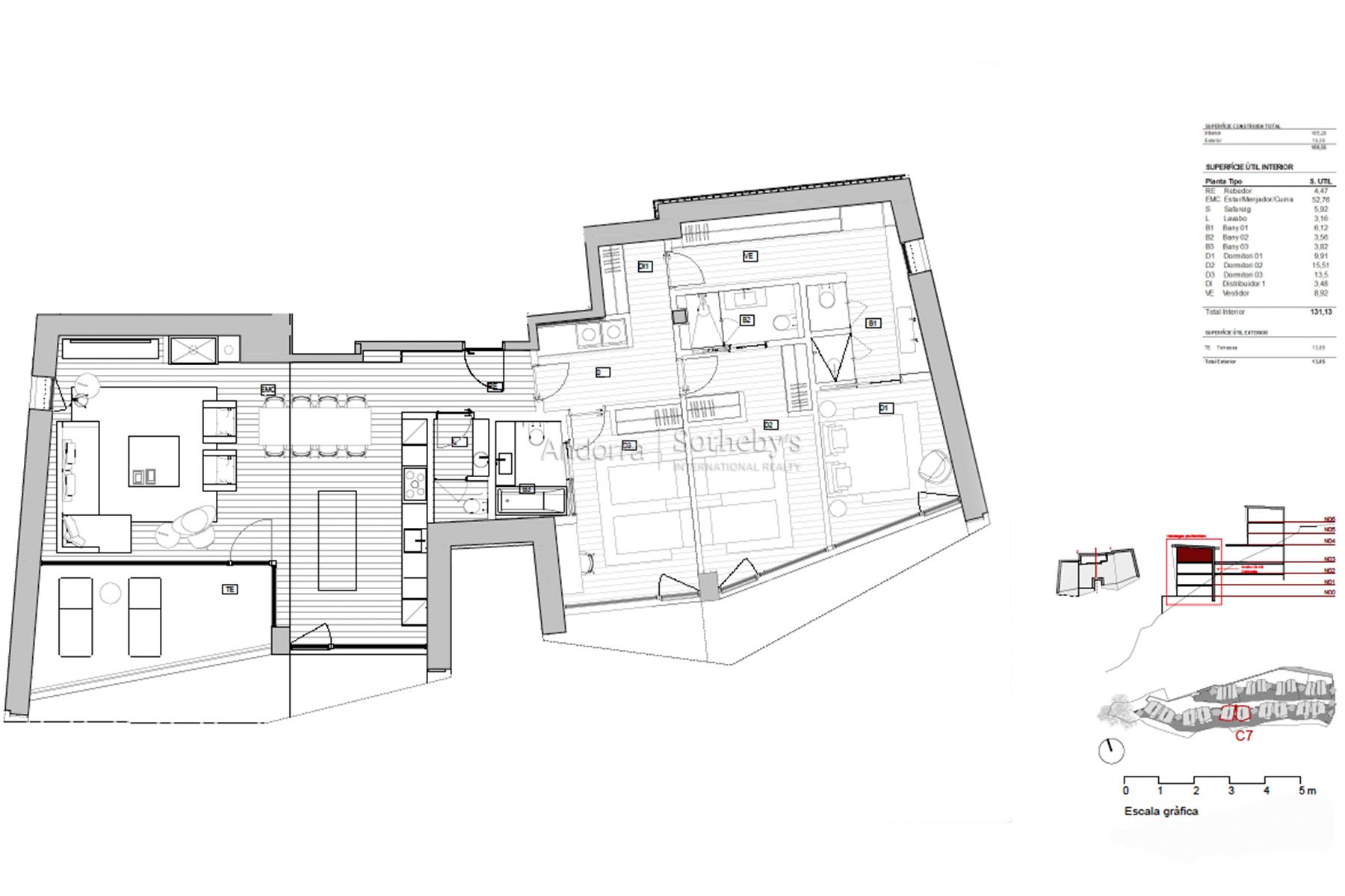 Bienvenido a su nuevo hogar en Els Vilars, Escaldes, donde la elegancia y la naturaleza se fusionan en perfecta armonía. Este exclusivo apartamento de obra nueva redefine el concepto de vida contemporánea, ofreciendo un espacio acogedor rodeado de un entorno natural privilegiado. Ubicado a solo unos minutos del vibrante centro de Andorra la Vella, disfrute de un acceso inmediato a una amplia gama de servicios, tiendas y opciones de ocio. Ideal para aquellos que buscan una vida activa y plena, sin renunciar al confort y la tranquilidad. Diseñada con un enfoque sostenible, esta propiedad es una joya arquitectónica que destaca por su estructura con amplios ventanales, que iluminan cada rincón con luz natural, creando una atmósfera de serenidad y pureza. Las impresionantes vistas que se ofrecen de Escaldes y de las majestuosas montañas a su alrededor, junto con su orientación sur, proporcionan una iluminación excepcional a lo largo del día, desde el amanecer hasta el atardecer. El apartamento cuenta con tres dormitorios en suite, un baño de invitados, un práctico lavadero y terrazas que ofrecen vistas privilegiadas. Su distribución inteligente incluye un amplio espacio de comedor con acceso a la terraza, así como una cocina equipada con una emblemática chimenea que integra los diferentes espacios con elegancia. Orientado principalmente hacia el sureste, el apartamento es un modelo de eficiencia energética, complementado con jardines y zonas verdes que proporcionan un espacio íntimo y relajante. Descubra la verdadera esencia de la vida andorrana en esta propiedad única, donde cada detalle ha sido cuidadosamente atendido para asegurarle el máximo confort y una existencia plena de armonía y belleza. Haga de su sueño una realidad y pregunte por esta excepción inmobiliaria hoy mismo.Características