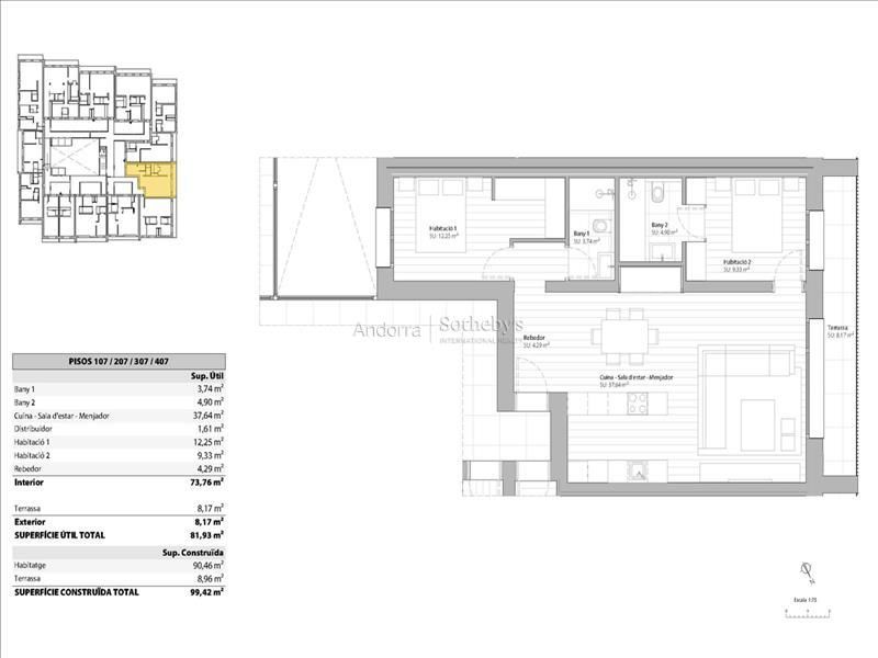 Descubre esta magnífica obra nueva ubicada en El Tarter. Con una superficie de 99,40 m2, esta propiedad ofrece un espacio moderno y espacioso para disfrutarlo al máximo. Con dos amplias habitaciones dobles, incluyendo una suite impresionante, este hogar es perfecto para aquellos que buscan comodidad y estilo. La cocina, integrada en el salón comedor, crea un ambiente acogedor y funcional. Desde aquí podrás acceder a una encantadora terraza de 8,95 m2 con vistas panorámicas al Valle de Canillo, y sol de tarde. Imagina disfrutar de las comidas exteriores o relajarte mientras contemplas las impresionantes vistas y las puestas de sol. El edificio cuenta con un box privado para dos coches, lo que brinda una comodidad adicional y permite tener tus vehículos protegidos del frío y la nieve. Esta propiedad está equipada con características de alta calidad, como iluminación LED de bajo consumo, suelo radiante y una elegante chimenea eléctrica. Además, cuenta con domótica que te permite controlar y gestionar fácilmente los sistemas del hogar desde su teléfono inteligente. Los electrodomésticos de primera calidad le ofrecen una experiencia culinaria excepcional, mientras que los suelos radiantes, y de gres porcelánico añaden un toque cálido, de sofisticación y durabilidad. La comunidad dispone de un spa y una zona de relax comunitario, donde podrás disfrutar de piscinas y jacuzzis, creando un ambiente de bienestar y relajación. Además un patio central con zona verde completa este entorno, proporcionando un espacio tranquilo y natural. No pierdas la oportunidad de vivir en esta maravillosa propiedad en El Tarter.