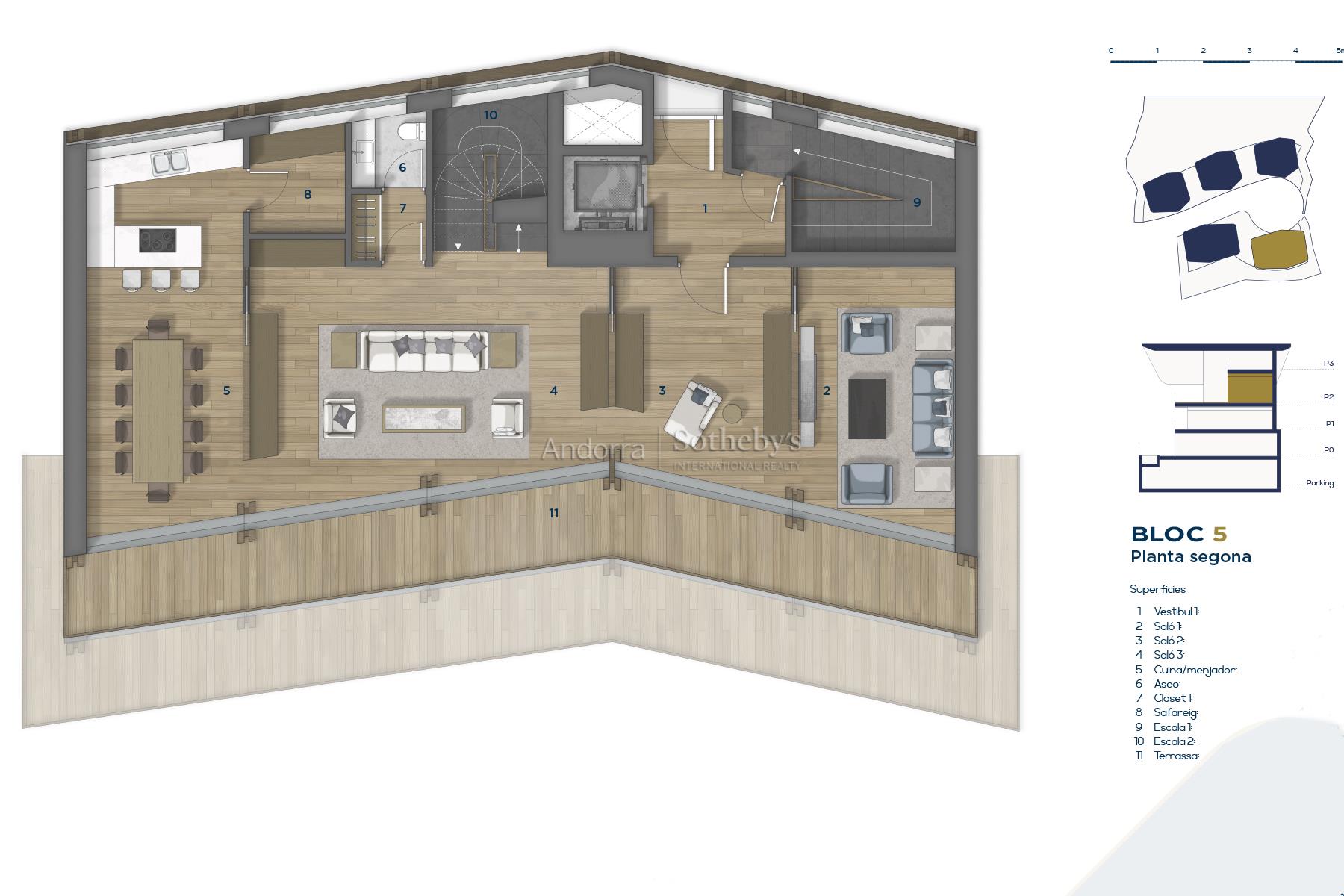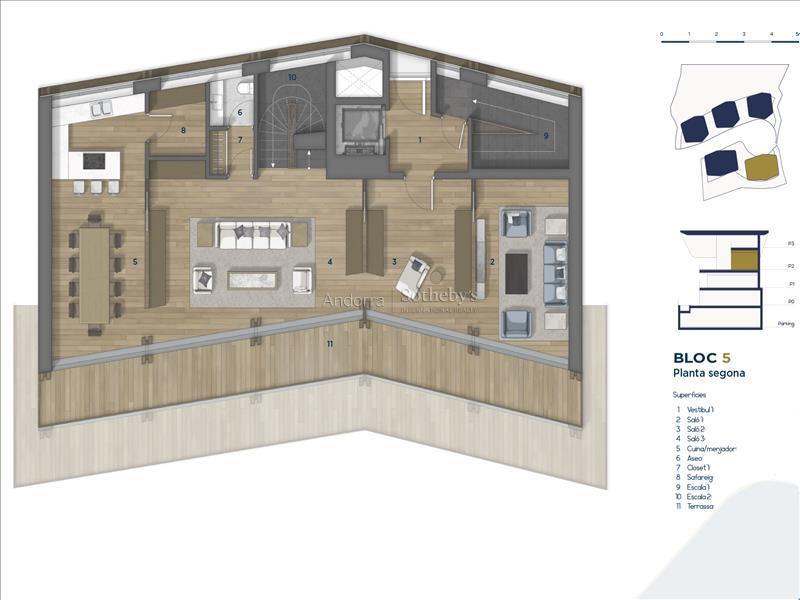 在迷人的奧爾迪諾村出售的獨家別墅,這是安道爾公國第一個被指定為生物圈保護區的目的地。這處令人驚嘆的物業是新建項目的一部分,以其優越的地理位置和奢華的設計而聞名,設計由著名的建築事務所拉斐爾·德拉霍茲建築師負責。 這是一處新建的物業,面積約669平方米,包括多個最佳方向的露台,以提供最大的自然光照,並享受奧爾迪諾及其山谷的壯麗景色。 底層旨在休閒,擁有水療區和健身房,還有一個電影院。在這一層還有兩間雙人套房,配有完整的浴室,一個客用衛生間和一個儲藏區,以及一個寬敞的露台。在第一層是休息區的延續,包括兩間套房,配有完整的浴室,以及該物業的主套房,設有更衣室和完整的浴室。所有臥室均可通往露台。第二層設有一個大型廚房,配有中央島,裝備了最新技術,並開放至一個舒適的餐廳,並可以通往露台。該區域還設有一個客廳和一個圖書館,這兩個空間同樣通往露台,還有一個客用衛生間和一個洗衣區。在最上面的閣樓層,有一個功能性的辦公室。 該物業擁有8個每個11.5平方米的停車位,總停車面積約706平方米。 裝修優雅且質量上乘,物業設計結合了現代元素,如大型窗戶,與傳統的安道爾石材和木材建築相結合,旨在更好地融入周圍環境,保持該國的精髓。特征