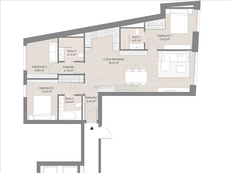 This magnificent newly built apartment, under construction, is located next to the main commercial avenue of La Massana, in a family residential area near the communal swimming pool and tennis courts, very quiet and perfectly connected. It has all the necessary services available and is only 400 meters from the cable car that allows access to the ski slopes of the Pal-Arinsal domain. The flat has 107m² distributed in a large living room, a large kitchen, integrated into the dining room, equipped with high-end appliances. In the rest area there are 3 bedrooms, all en suite with full bathroom, and all three with built-in wardrobes. The property has a parking space in the same building. This exclusive apartment, perfectly located, is an excellent investment for a family looking for a prestigious residence in the center of a city with the dynamism of La Massana and wants to enjoy its wide range of activities with all the space and the necessary amenities.Features