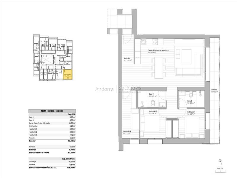 Discover this magnificent new work located in El Tarter. With an area of 106.03m2, this property offers a modern and spacious space to enjoy it to the fullest. The kitchen, integrated into the living room, creates a cozy and functional atmosphere. From here you can access a lovely 10.86m2 terrace with views. With two spacious double bedrooms, including a stunning suite, a single bedroom, and two full bathrooms, this home is perfect for those looking for comfort and style. The building has a private garage for two cars, which provides additional comfort and allows you to have your vehicles protected from the cold and snow. This property is fitted with high quality features including energy efficient LED lighting, underfloor heating and an elegant electric fireplace. In addition, it has home automation that allows you to easily control and manage home systems from your smartphone. Top-quality appliances offer you an exceptional culinary experience, while radiant floors and porcelain stoneware add a touch of warmth, sophistication and durability. The community has a spa and a community relaxation area, where you can enjoy swimming pools and jacuzzis, creating an atmosphere of well-being and relaxation. In addition, a central courtyard with a green area completes this environment, providing a quiet and natural space. Don't miss the opportunity to live in this wonderful property in El Tarter.Features