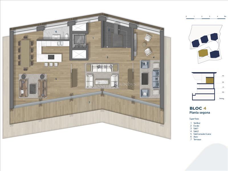 Exclusivo chalet para comprar en el encantador pueblo de Ordino, el primer destino del Principado de Andorra nombrado como Reserva de la Biosfera. Esta sensacional propiedad forma parte de una promoción de obra nueva que destaca por su privilegiada ubicación a la vez que por su lujoso diseño, ideado por el prestigioso estudio de arquitectura Rafael De la-Hoz Arquitectes. Se trata de un inmueble de nueva construcción de aproximadamente 669 m² construidos, los cuales incluyen múltiples terrazas orientadas de forma óptima para aportar la máxima exposición posible a la luz natural, y disfrutar a su vez de las magníficas vistas de Ordino y sus valles. La planta baja está destinada a la desconexión, por lo que cuenta con zona de spa y gimnasio, además de una sala de cine. En esta planta se encuentran además dos habitaciones dobles en suite con baño completo, un aseo y una zona de almacenamiento, además de una amplia terraza. En la primera planta se encuentra la continuación de la zona de descanso, con dos habitaciones en suite con baño completo, y la master suite de la propiedad, con vestidor y baño completo. Todas las habitaciones tienen salida a la terraza. La segunda planta está distribuida en una gran cocina con manzana central, equipada con las últimas tecnologías y abierta a un acogedor comedor con acceso a la terraza. En esta zona se encuentra igualmente un salón y una biblioteca, ambos espacios también con salida a la terraza, un aseo y una zona de lavandería. En la última planta, abuhardillada, se ubica un funcional despacho. la propiedad tiene 8 plazas de parquing de 11,5 m2 cada una, en total unos 706 m2 de zona de parquing. Los acabados son elegantes y de la más alta calidad, y el diseño de la propiedad combina elementos modernos, como las grandes vidrieras, con la clásica arquitectura andorrana en piedra y madera para integrarse de la mejor forma en el entorno y no perder la esencia del país.Características